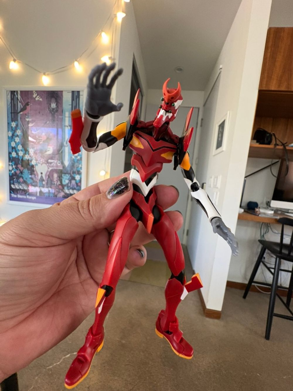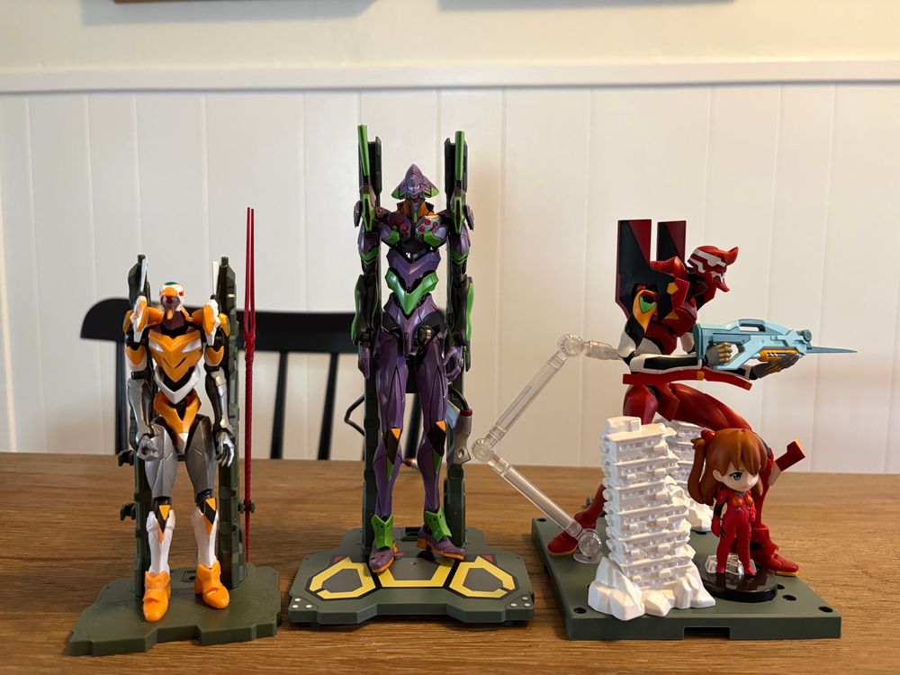 Unit 01 is a circa-2020 "real grade" Bandai model. The shoulders open and contain the knives, and there's a movable port for the entry plug. About 7 inches.
