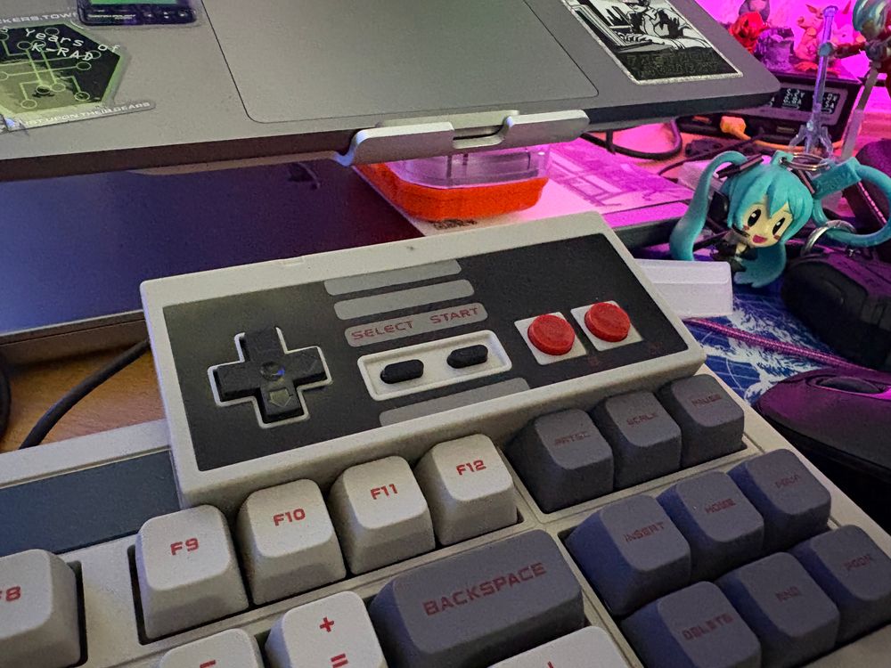 Nerdy: Got my old NES controller hooked up via USB to my computer. Here it is on my matching keyboard. Now if only my desk was clean.