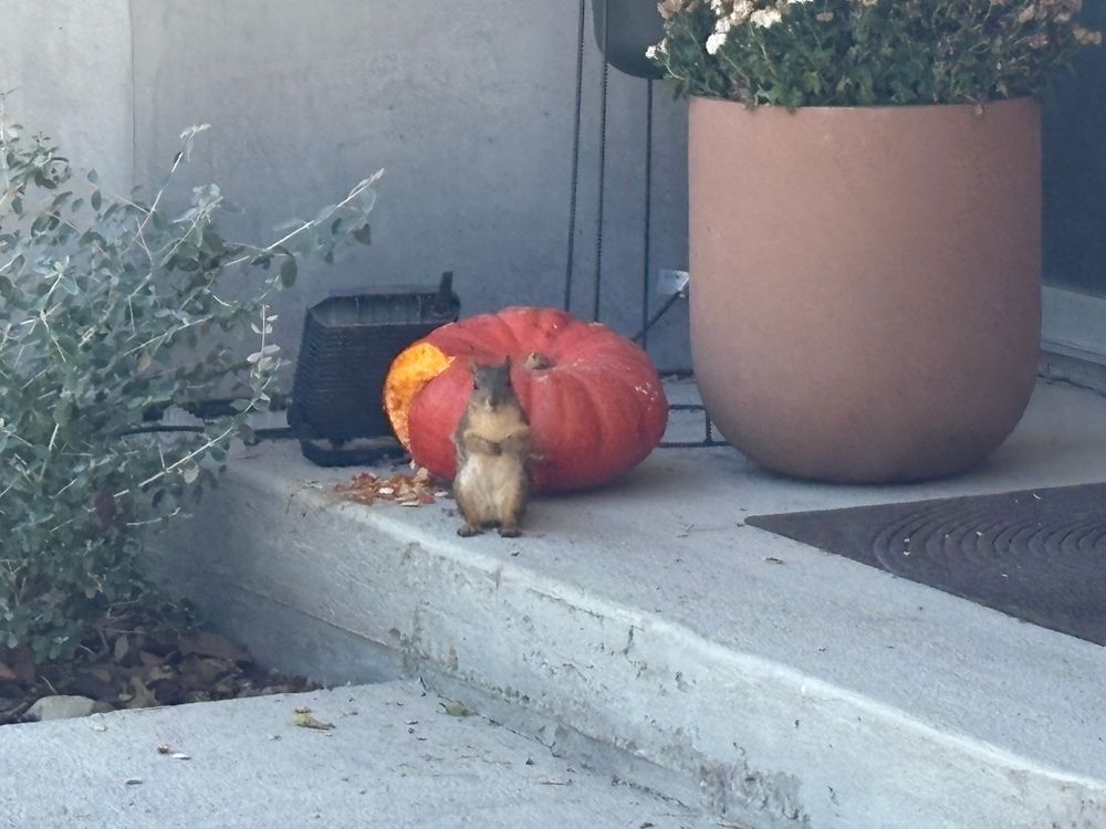 Squirrels have been slowly eating all of our Halloween pumpkins. Caught this guy looking guilty!!!