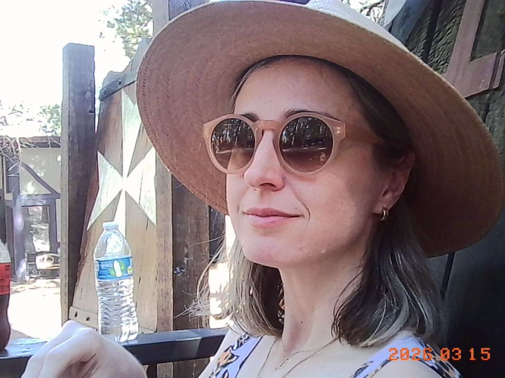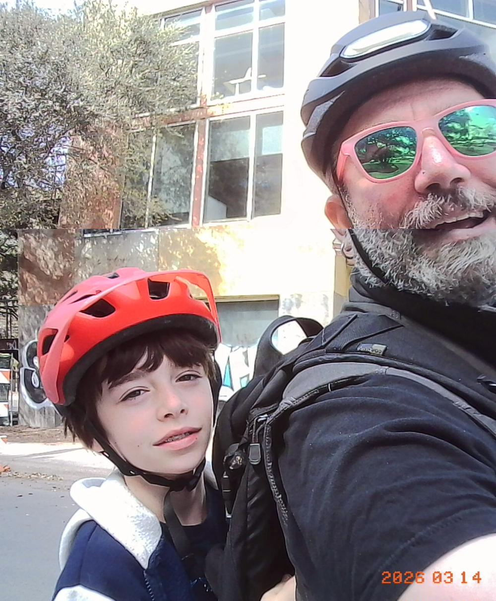 D and I on my bike, zooming to downtown. This is actually 2 shots from my Charmera that I stitched together roughly - notice my weird mouth!