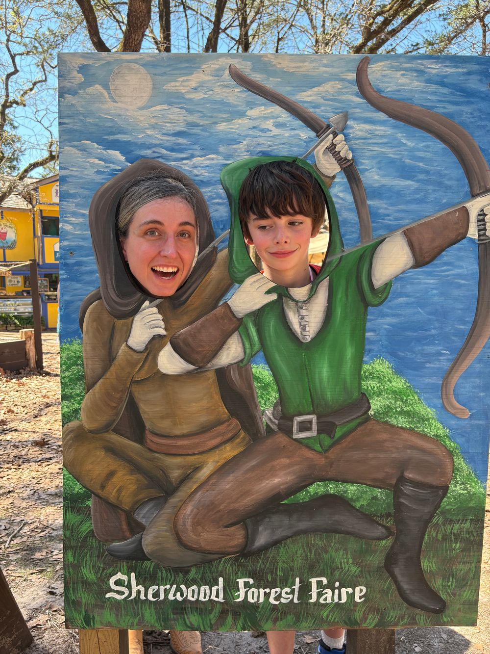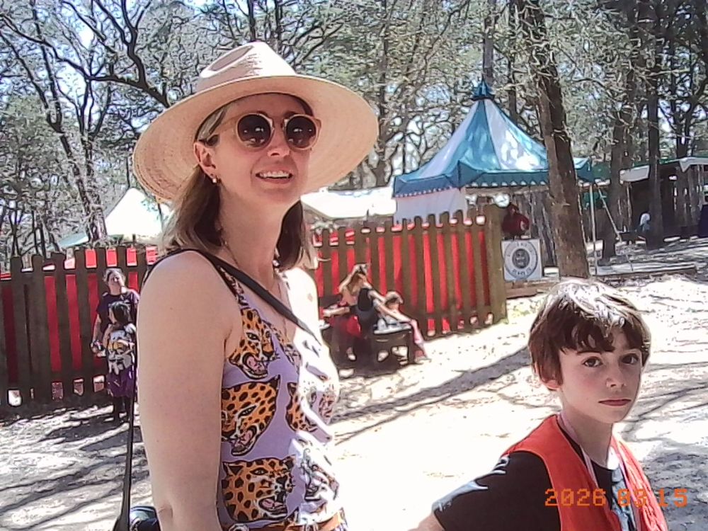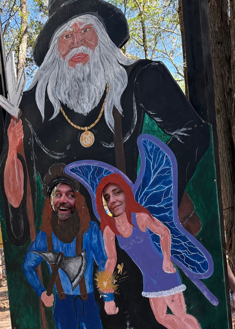 K+D about to mount the SKY CHAIRS ride - swings powered by two burly pirates intent on spinning everyone til they barf.